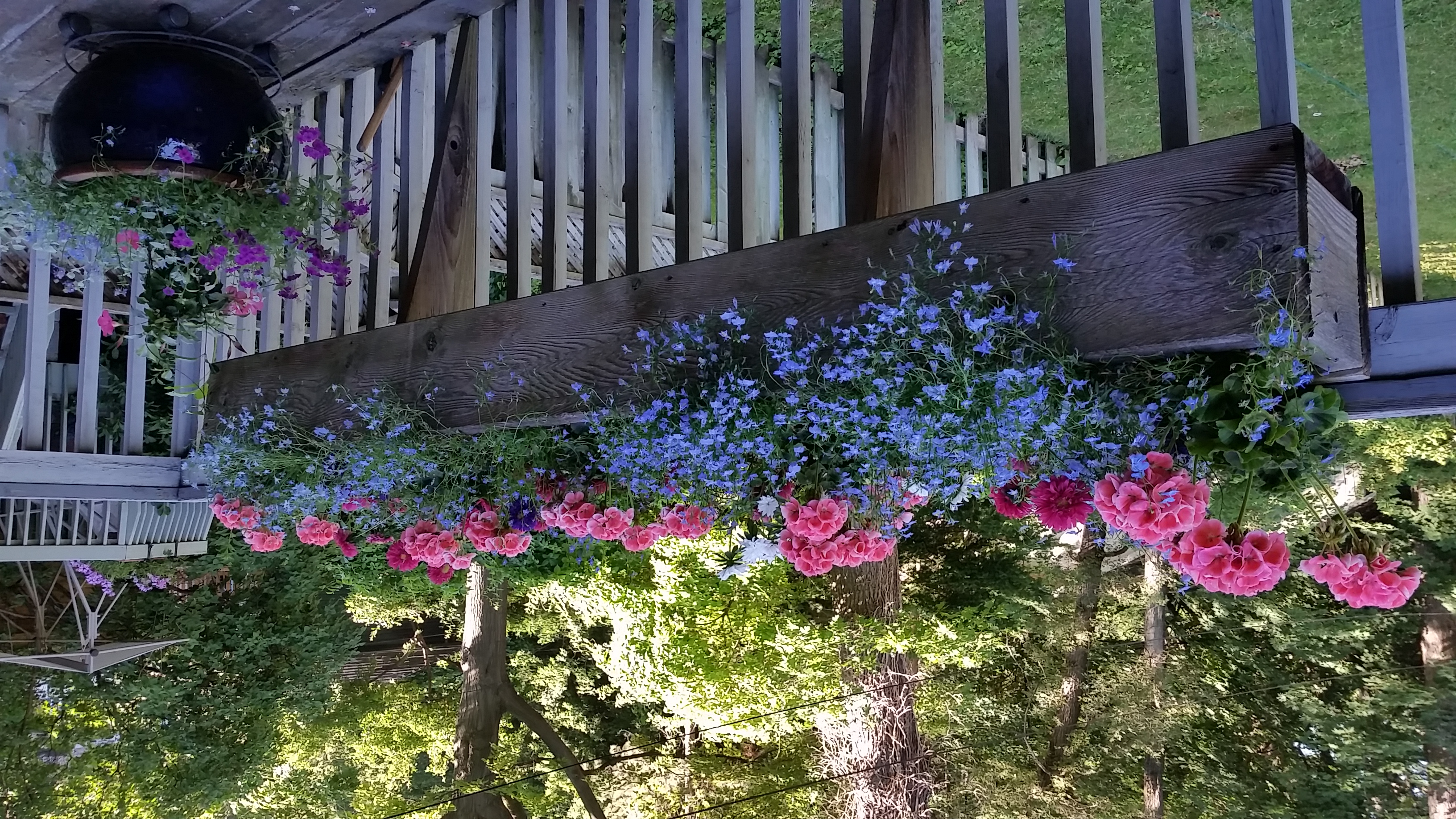 This older balcony planter needed colour, but low plants that wouldn't block the view from the kitchen window into the yard