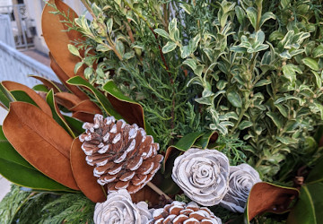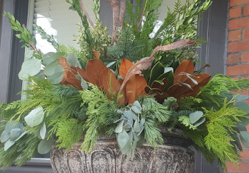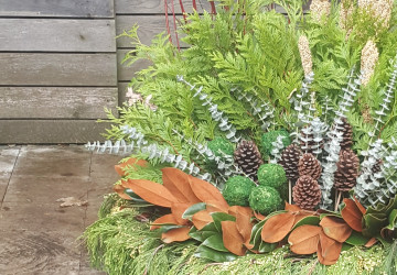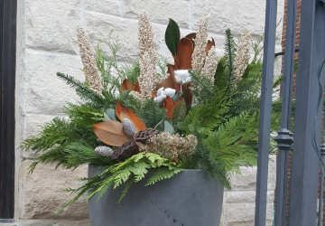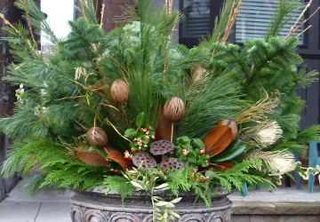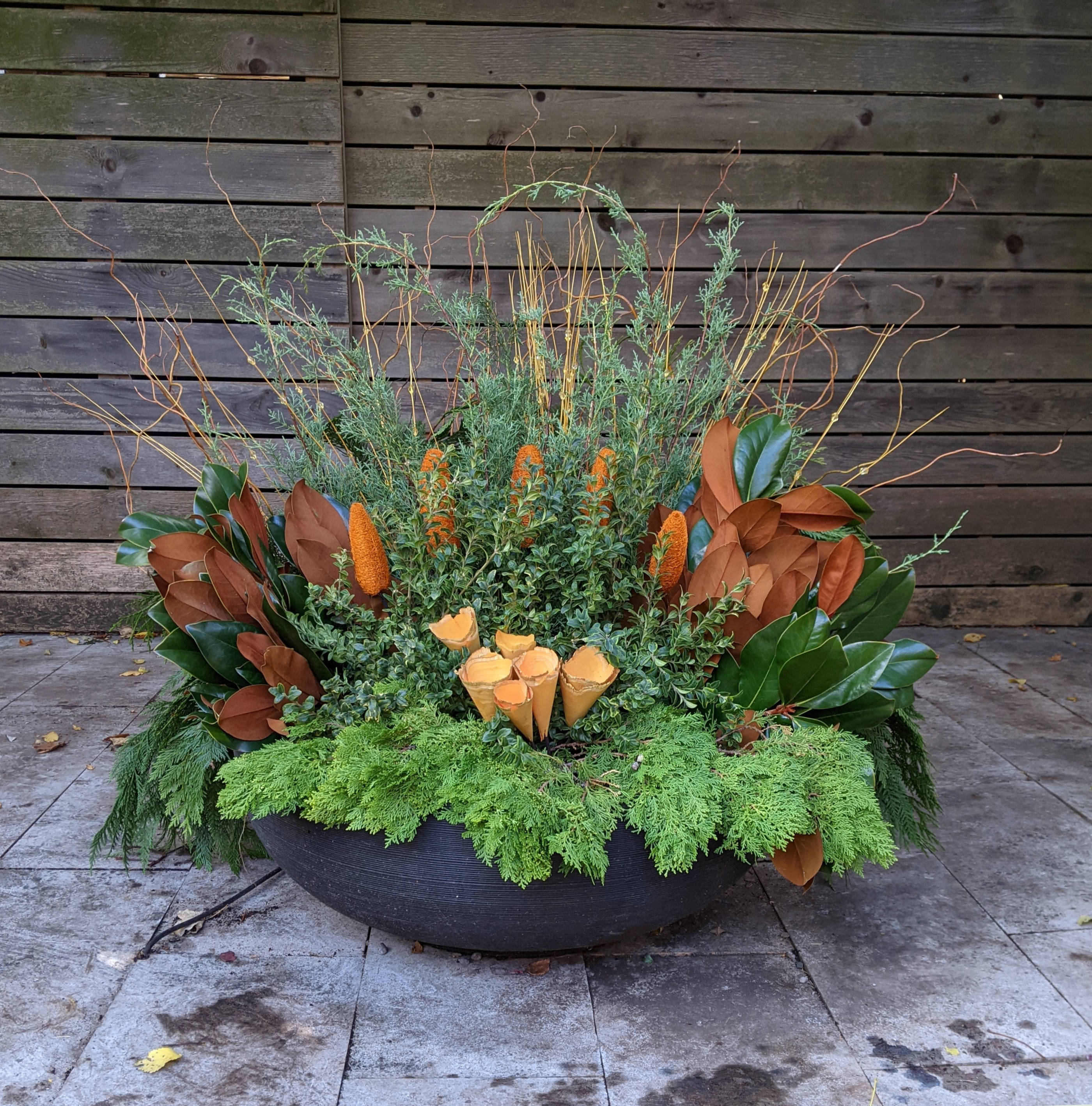 Tell me the size of your planters and the colour scheme you would like. Any other criteria? For instance, this is a 36" round planter with a variety of greens and colourful natural accents arranged symmetrically.